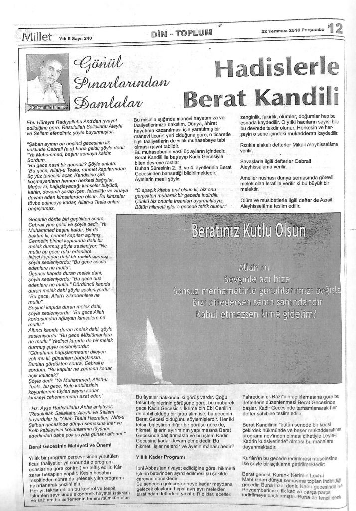 GÖNÜL PINARLARINDAN DAMLALAR – MİLLET GAZETESİ (HADİSLERLE BERAT KANDİLİ)