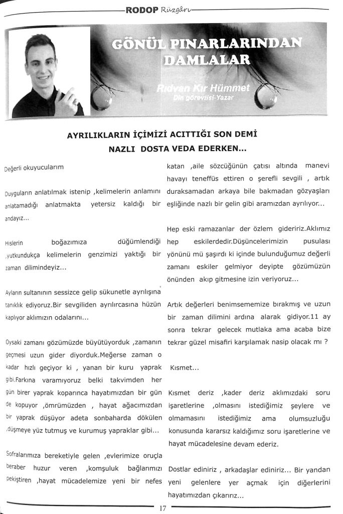 RODOP RÜZGARI DERGİSİ (GÖNÜL PINARLARINDAN DAMLALAR) AYRILIKLARIN İÇİMİZİ ACITTIĞI SON DEMİ NAZLI DOSTA VEDA EDERKEN…
